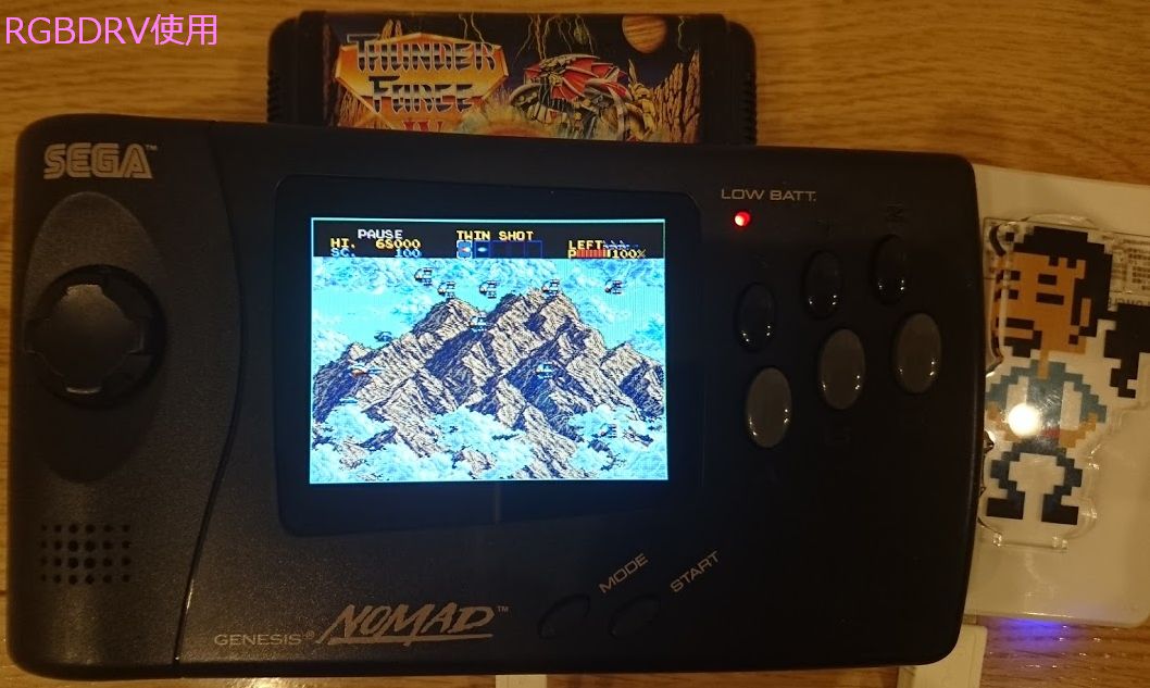 備考: NOMAD標準の液晶パネルだと、現在の携帯用ゲーム機の画面と比べれば落ちます。あくまで無改造のゲームギアと比較して鮮明だということです。ただし、後述するRGBDRVを使えば今どきの液晶を使えるので見劣りしなくなります。
