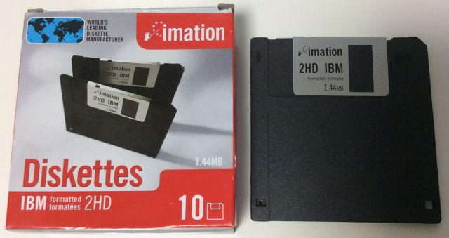 3.5インチのフロッピーである「MF2-HD」という一般に浸透している媒体を使用します。なお、MF2-HDという種類のフロッピーディスクは、単に2HDと書かれて売られていることが多いです。